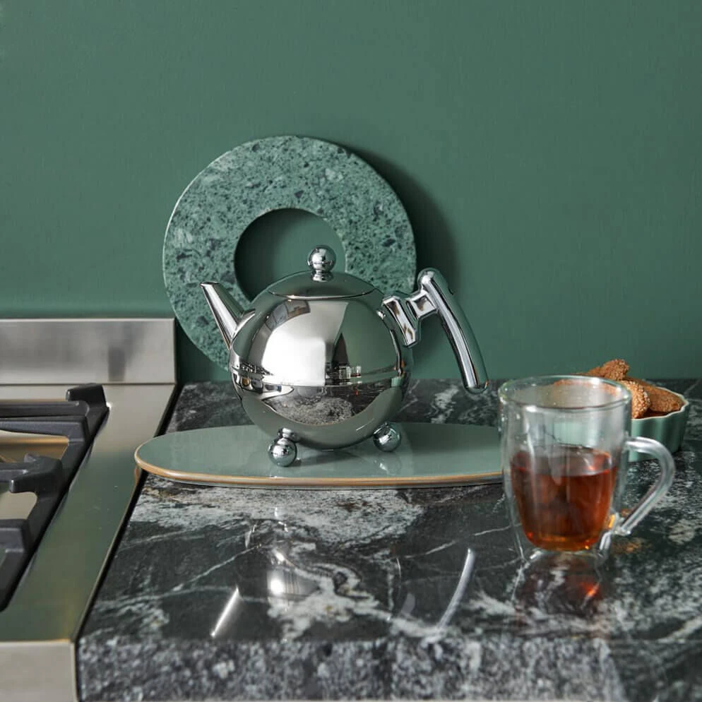 De Bredemeijer Duet Bella theepot is vervaardigd uit glanzend roestvrij staal. De theepot is dubbelwandig waardoor de inhoud langer op temperatuur blijft. De Bredemeijer theepot heeft een inhoud van 0,75 liter en is voorzien van verchroomde kunststof grepen. Gebruik de theepot voor het maken en uitschenken van thee.
