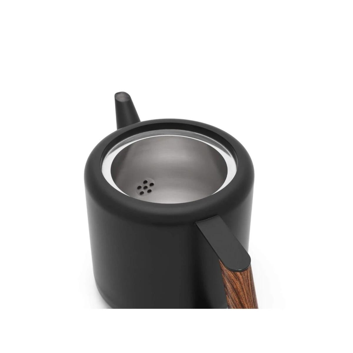 De Bredemeijer Duet Design theepot is vervaardigd uit mat zwart roestvrij staal. De theepot is dubbelwandig waardoor de inhoud langer op temperatuur blijft. De Bredemeijer theepot heeft een inhoud van 1,1 liter en is voorzien van kunststof grepen met een houtlook. Gebruik de theepot voor het maken en uitschenken van thee.