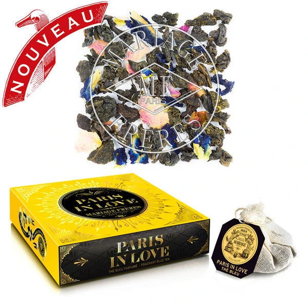 Mariage Frères-thee komt in een zwart doosje met een inhoud van 30 zakjes thee. De Paris in Love is een zoete blauwe thee met tonen van rood fruit en rozenblaadjes.